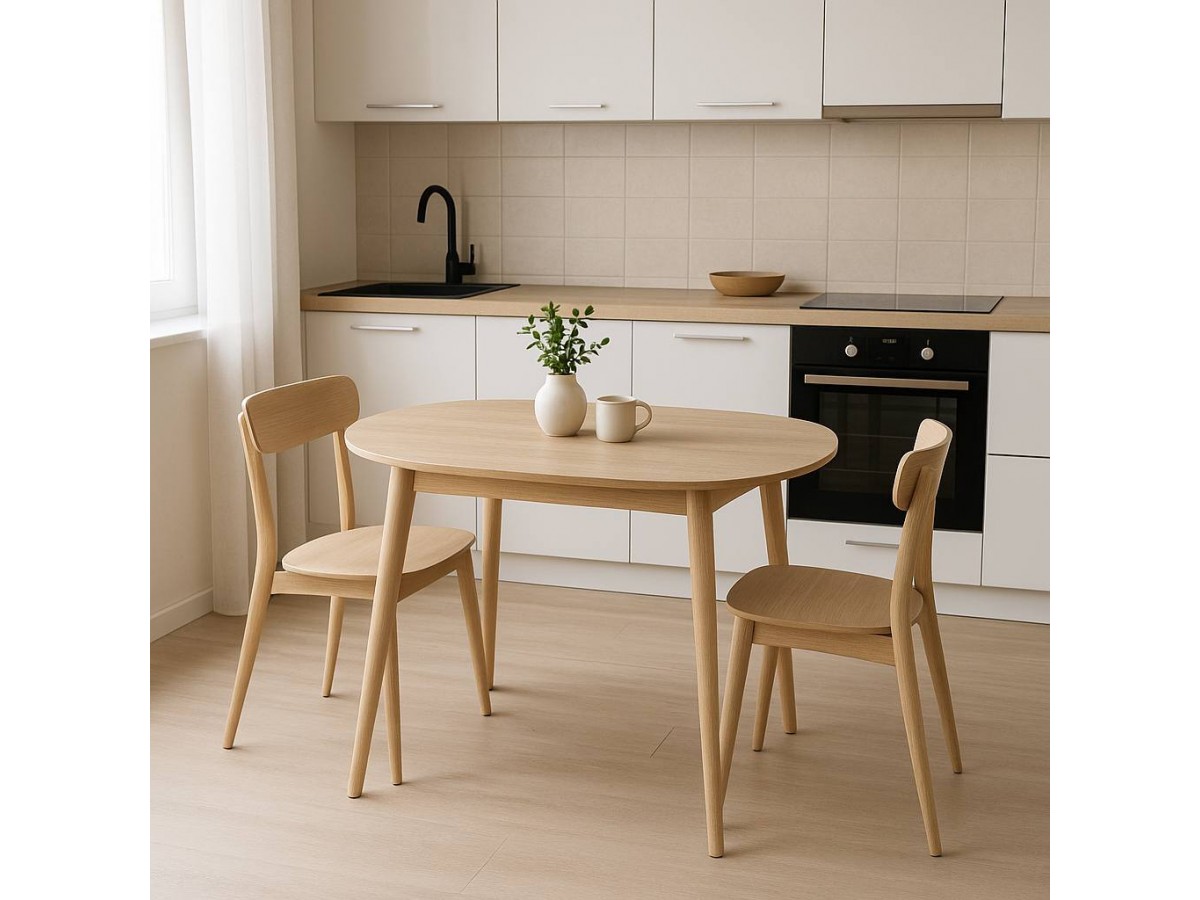 Навіть за діаметра 90 см можна зручно посадити 3–4 людини. Округлі лінії не створюють гострих кутів, тому кухня виглядає просторішою й “легшою”.