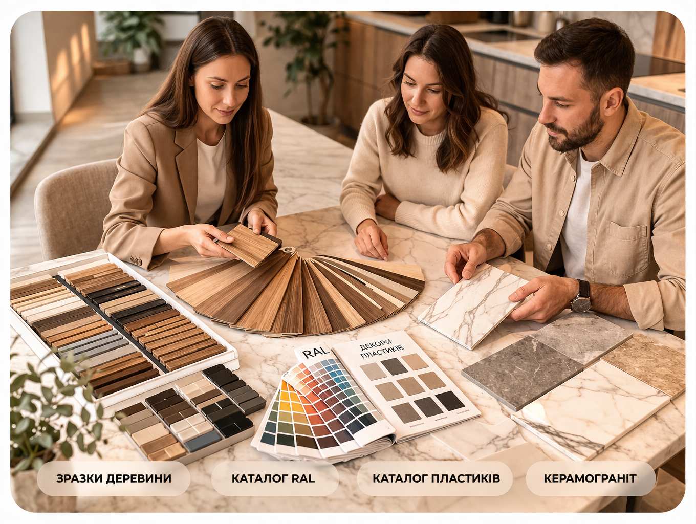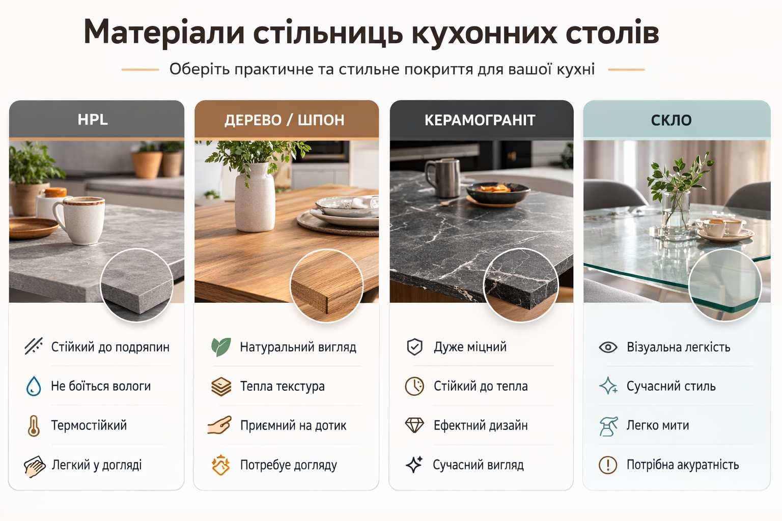 Для активної кухні часто обирають HPL або керамограніт, оскільки ці матеріали дуже стійкі до подряпин, вологи та високих температур.