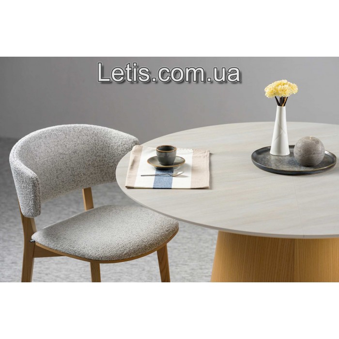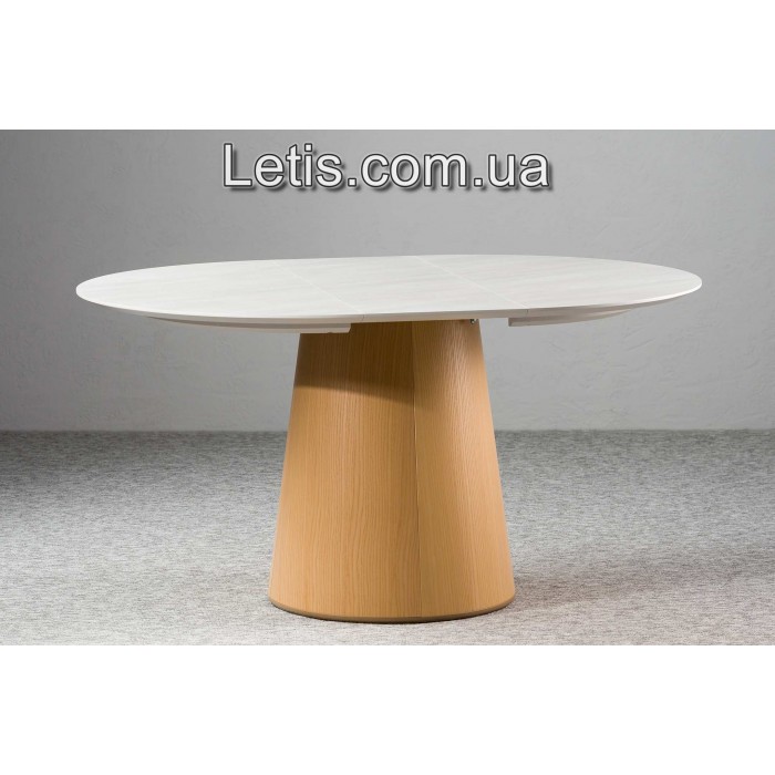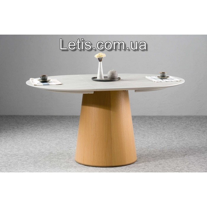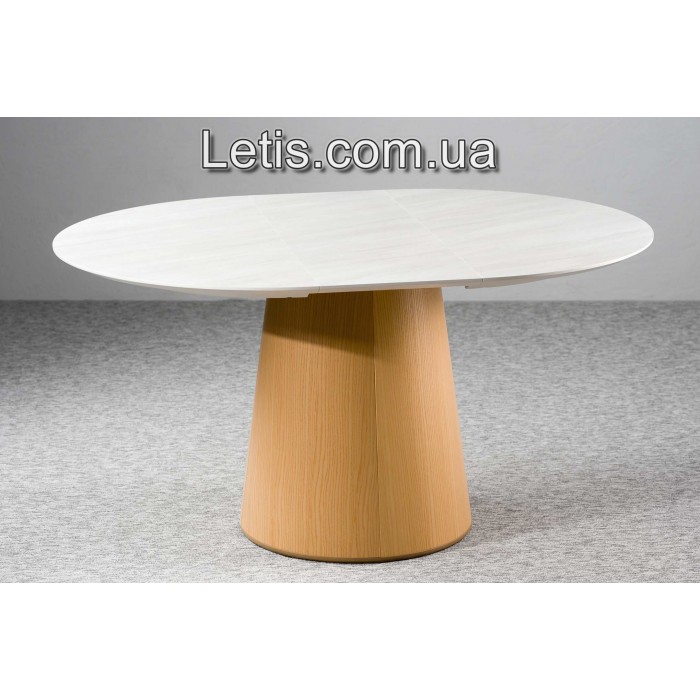 Щоб збільшити стіл, кругла стільниця розсувається на дві частини — механізм схований у конструкції, рух відбувається плавно.