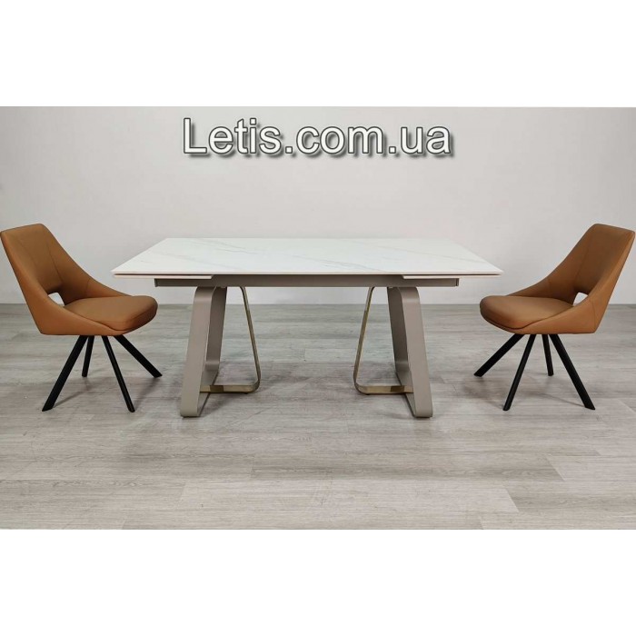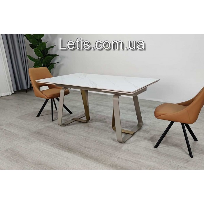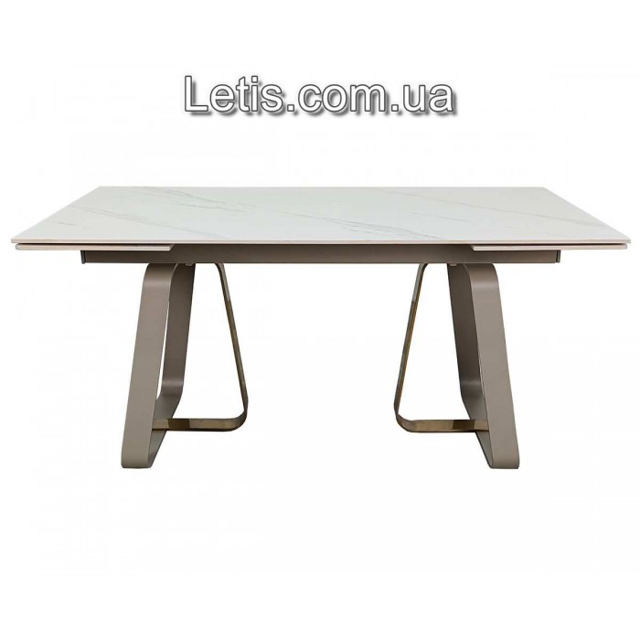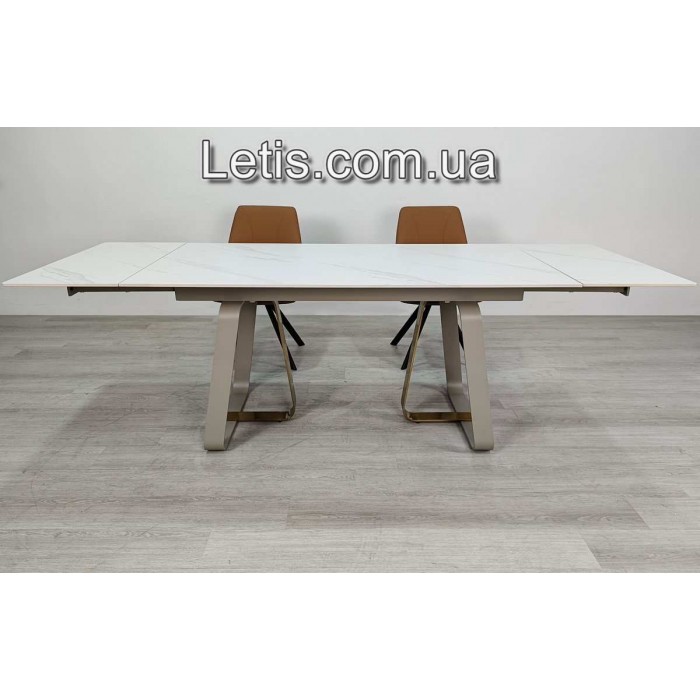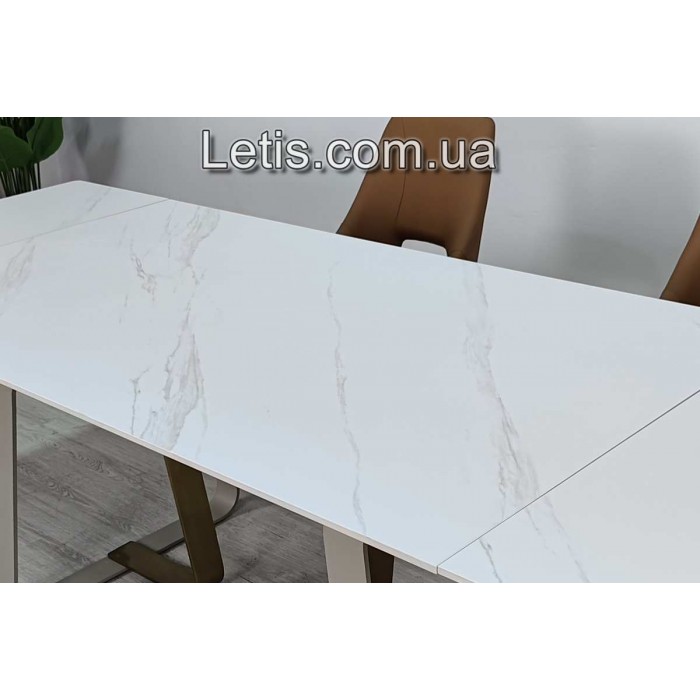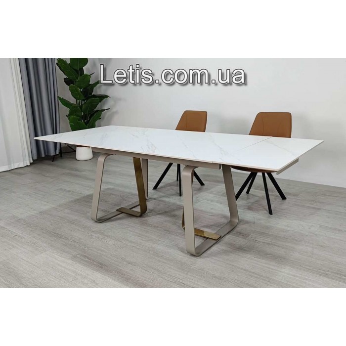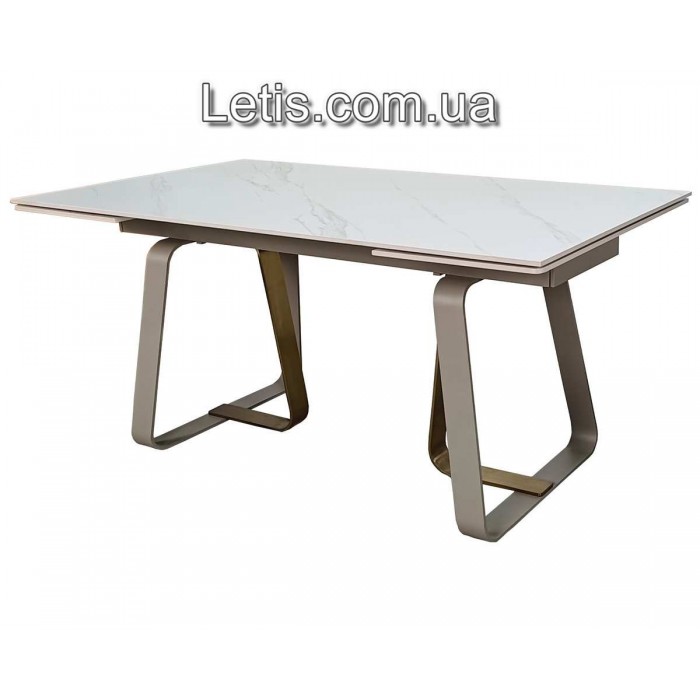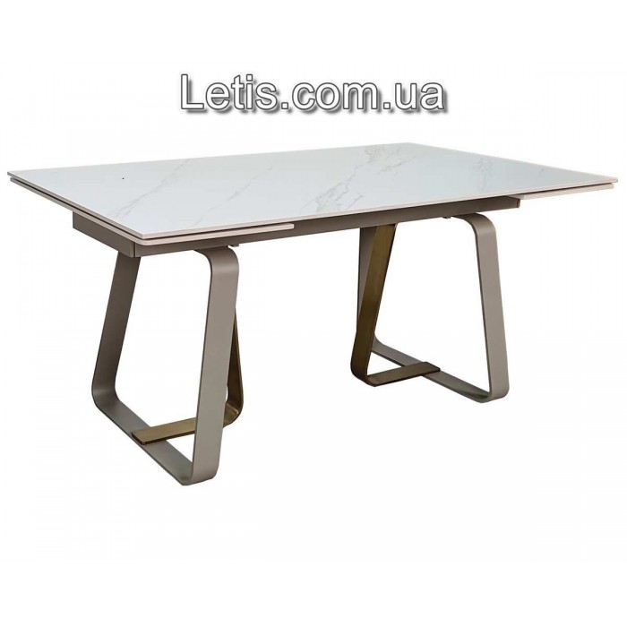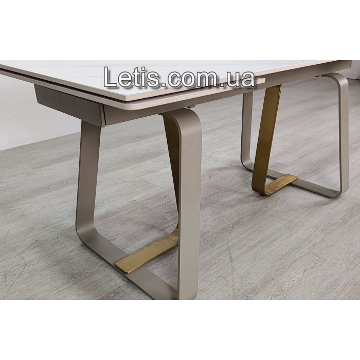 Стіл Bianco Luxe — розкладний кухонний стіл 160×90 см із суцільною керамогранітною стільницею та акцентним металевим каркасом у кольорах кашемір і золото