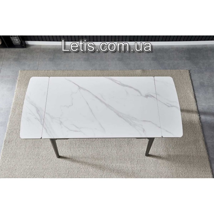 Стіл Bonn II — це сучасний кухонний стіл зі стільницею з керамограніту “під камінь/мармур” та елегантною базою: дерев’яний каркас у чорному кольорі. Розмір у складеному вигляді — 140×90 см, а для гостей стіл легко збільшується до 200×90 см завдяки двом торцевим вставкам по 30 см (разом +60 см).