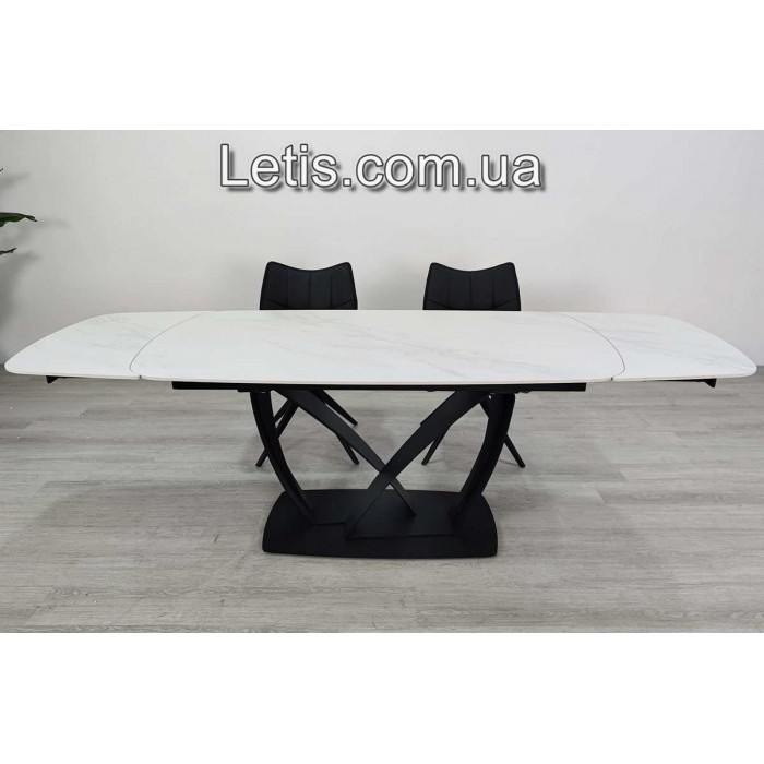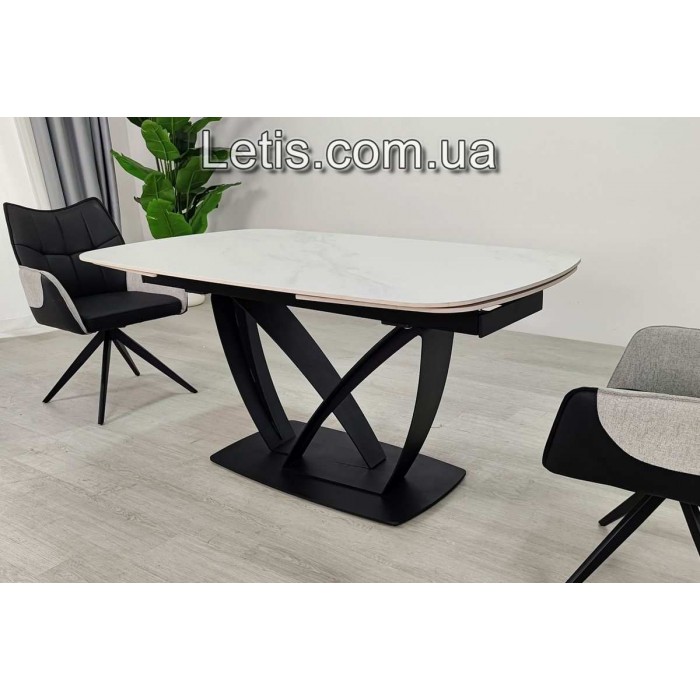 Якщо ви шукаєте розкладний кухонний/обідній стіл з керамічною стільницею, модель Tyler — майже «близнюк» стола Julian за форматом і матеріалами, але з іншою, більш округлою та пластичною формою опори. Додатково Tyler легко впізнати за заокругленням з коротких сторін стільниці — торці не прямі, а м’яко скруглені, завдяки чому стіл виглядає легшим і безпечнішим у щоденному користуванні.
